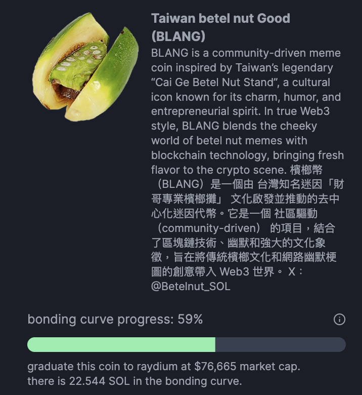 据 Pump.fun 资讯,槟榔币的市值需要达到 76,175 美元才能完成「发射」,也就是将流动性迁移至 Solana 链上去中心化交易所 Raydium。目前进度已达 59%。