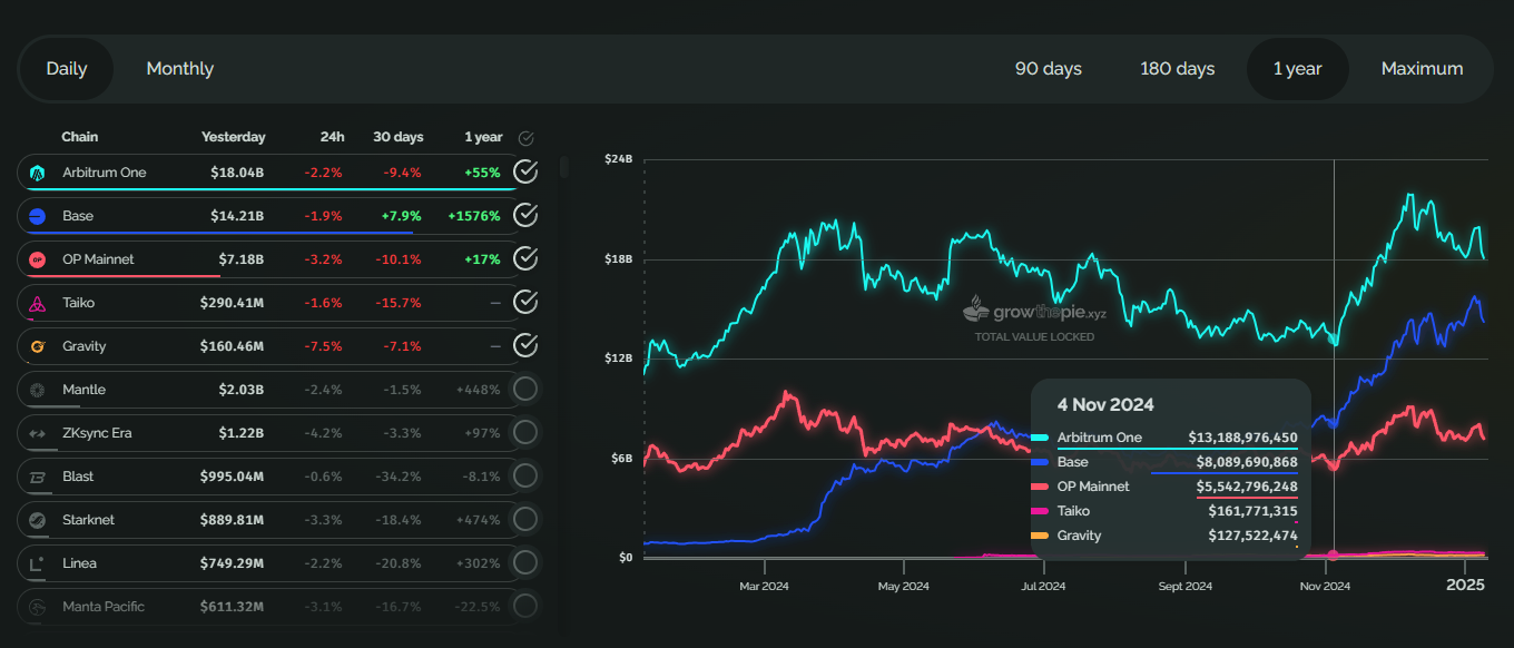 从细节的变化上来看,也确实如此。Base的TVL量似乎从11月3日开始迎来了大幅增长。不过这也不是Base的个例,Arbitrum在同期也迎来了一波高速发展。