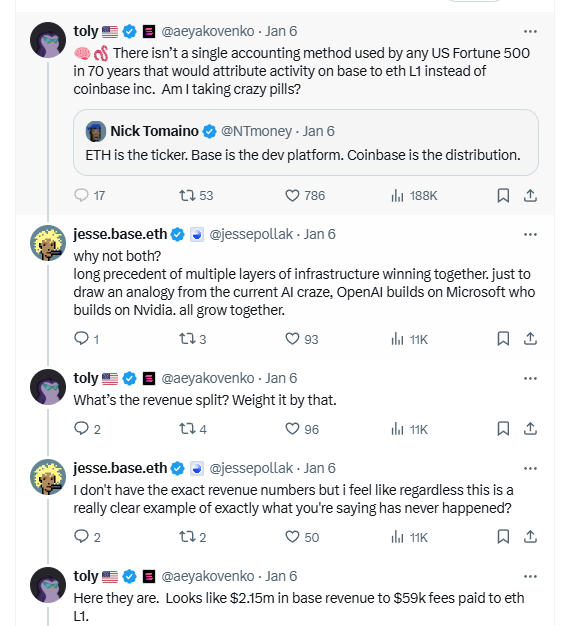 Toly随后则比喻道,正如谷歌和微软的竞争,都为Linux作出了贡献,但在价值捕获上,这是分开的。因此,没有任何一家美国500强公司使用单一的会计计算方法将Base的活动归因于以太坊,而是都计入到Coinbase公司。而Base产生的215万美元的收入,也仅支付给以太坊主网5.9万美元。
