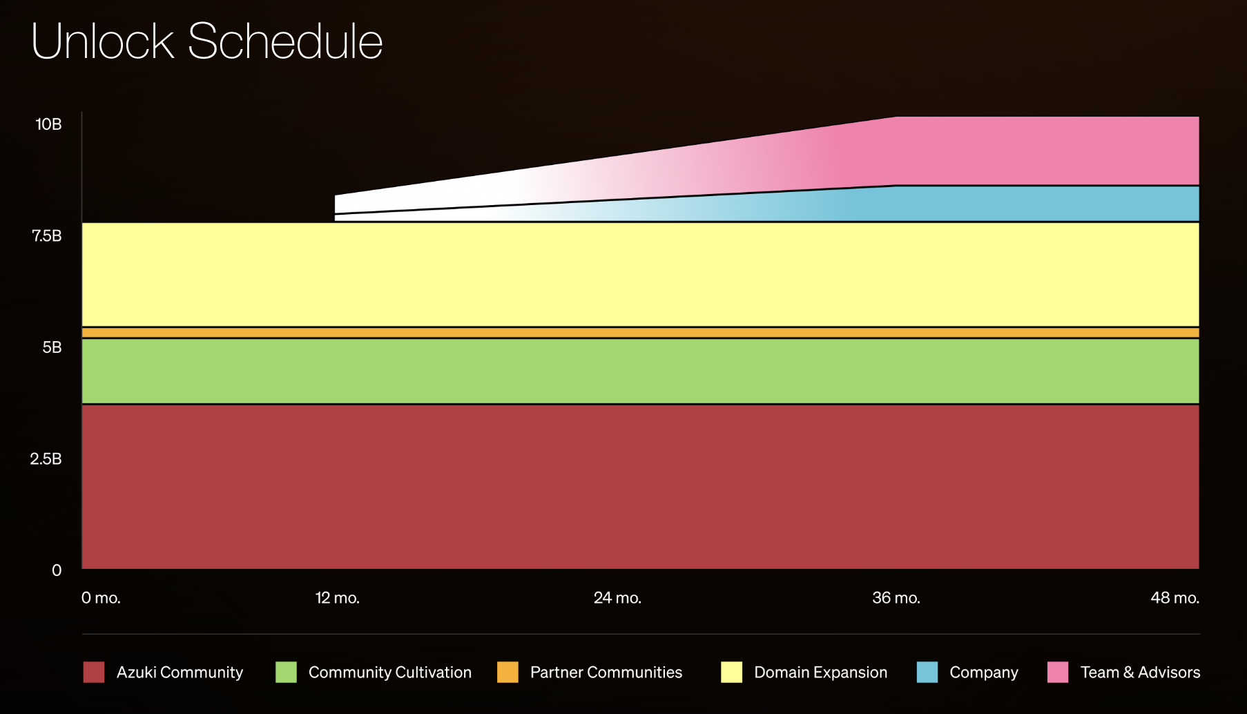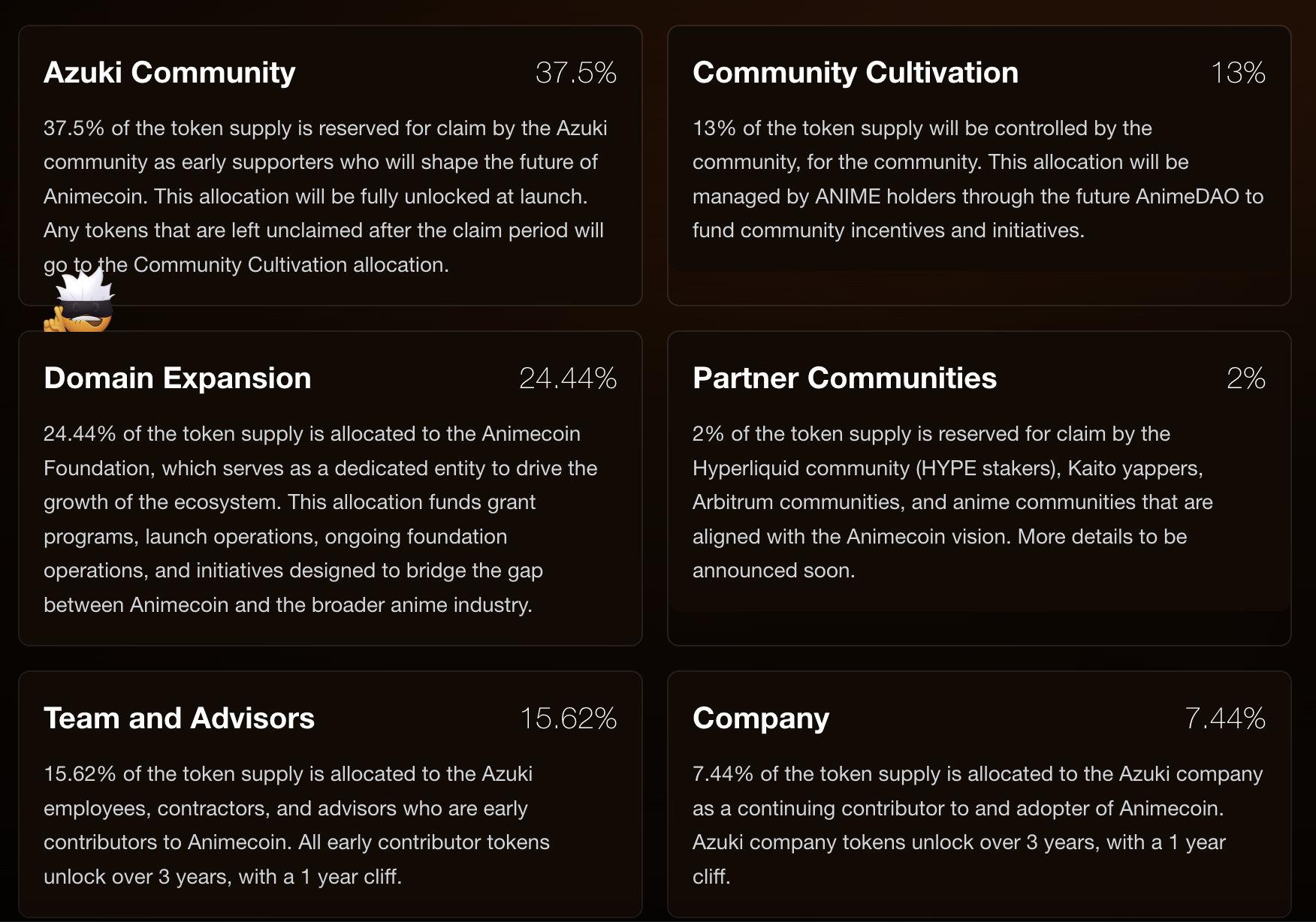 ANIME的代币经济学显示,ANIME代币总供应量为100亿枚,初始流通量为76.9亿枚,即初始流通比例达76.9%。具体分配上,37.5%将分配给Azuki社区、13%将用于AnimeDAO、24.44%将分配给Animecoin基金会、2%将分配给合作社区、15.62%将分配给团队和顾问(1年锁定期后解锁33.33%,其余部分按剩余线性解锁)、7.44%将用于Azuki公司(1年锁定期后解锁33.33%,剩余线性解锁)。作为TGE的一部分,Hyperliquid社区(HYPE质押者)、Kaito yappers、Arbitrum社区等将作为合作社区,获得ANIME代币的空投。