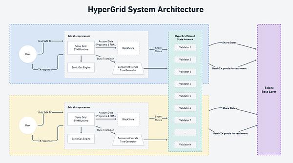 Sonic SVM围绕HyperGrid技术展开,通过构建多网格架构(Grids),实现游戏和DApp的分布式运行。
