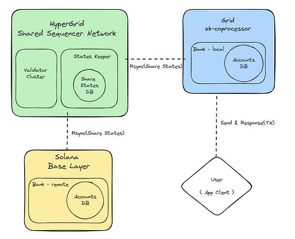 Grids旨在允许大量在HyperGrid上运行的DApp,以减少对Solana L1性能的影响,并最小化DApp之间的性能干扰。在HyperGrid架构的支持下,DApp开发者可以根据自身需求选择使用HyperGrid公共网格,或者进行水平扩展以创建他们自己的专属网格。选择完全取决于开发者对性能和成本的评估。此外,DApp开发者也可以关闭他们创建的网格,而不会影响其他网格,因为每个网格产生的交易和状态变更的验证、记录和读取,最终都是通过HyperGrid与Solana L1之间的连接独立完成的。