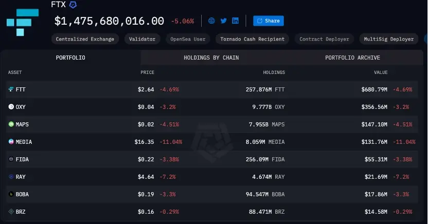 FTX 目前的钱包和持币在 Arkham 上公开可查。 截止文章写作时间,FTX 的链上地址还有 14.75 亿美元的总计资产,最大的保有量币种为 FTT,价值约 6.8 亿美元。