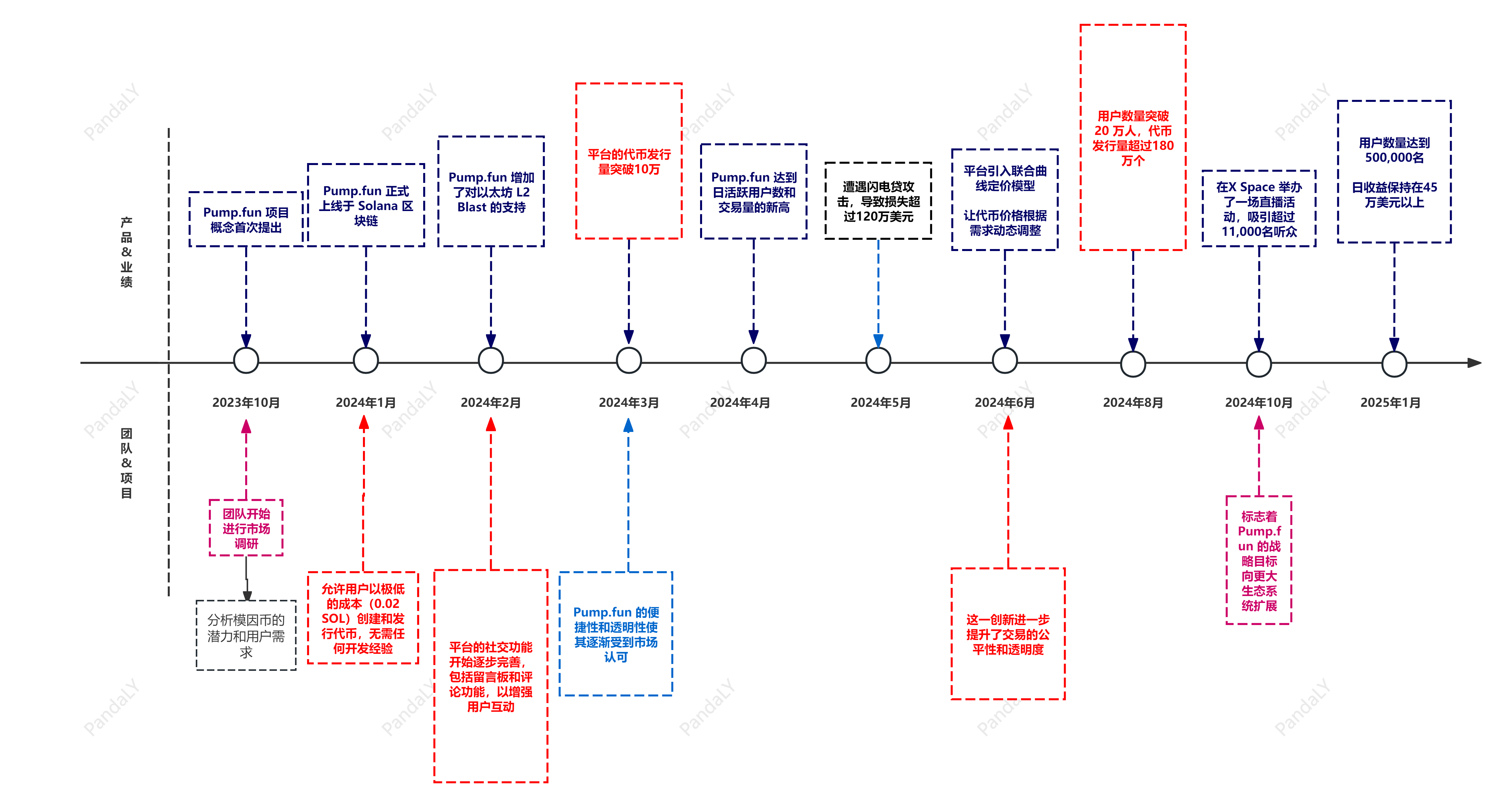 Pump.fun是一个基于Solana 区块链的 Meme 币(Memecoins)创建与交易平台,致力于简化代币发行流程,降低技术门槛,让任何用户都能轻松创建和交易自己的数字资产。凭借创新的机制设计和对 Meme 文化的深度结合,Pump.fun 成为 DeFi 和 Meme 文化交叉领域的重要项目。下图为Pump.fun创建历程与关键事件。