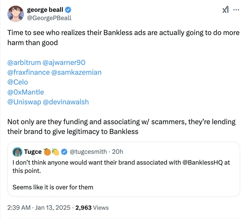 但 Bankless 的品牌形象遭受了巨大的打击,社区中有人艾特 Bankless 的节目赞助商,称其为骗子的帮凶。