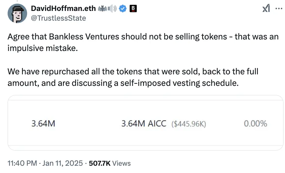 在 Andy 的推文发酵后,Bankless 联创 David 回应表示已经对 Bankless ventures 出售的 AICC 份额进行回购,称这是「一个冲动的错误」。