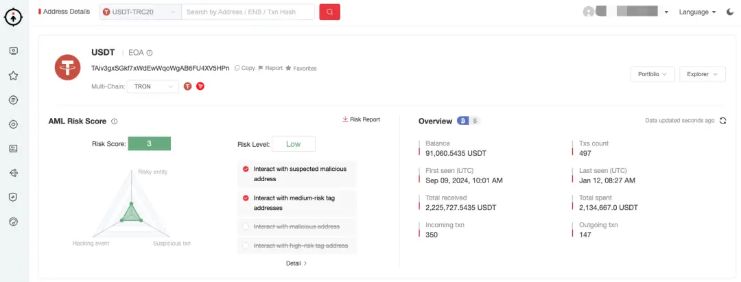 接着,我们使用链上反洗钱追踪平台 MistTrack 对该 TRON 地址进行分析,结果显示该地址初始交易发生于 2024 年 9 月 9 日,最近一笔交易发生于 2025 年 1 月 12 日,共收到过 222 万 USDT,目前余额为 9.1 万 USDT,该地址曾与多个恶意地址及中风险地址交互。