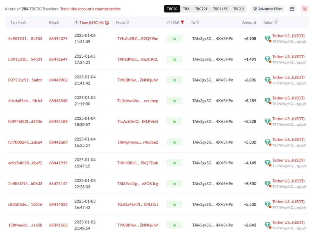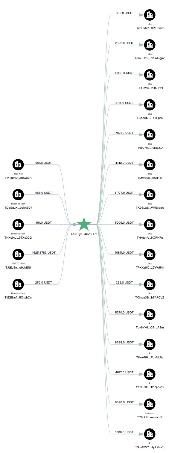 根据泰国达府移民局 1 月 7 日公布的时间线,王星于当地时间(泰国时间 UTC+7)1 月 3 日凌晨 3 时 16 分入境泰国,3 时 40 分乘车离开素万那普机场,随后于 11 时左右失联。我们对截图中提到的地址 TAiv3gxSGkf7xWdEwWqoWgAB6FU4XV5HPn 以 1 月 3 日凌晨 4 时 16 分(中国时间 UTC+8)为起始的接收交易进行分析: