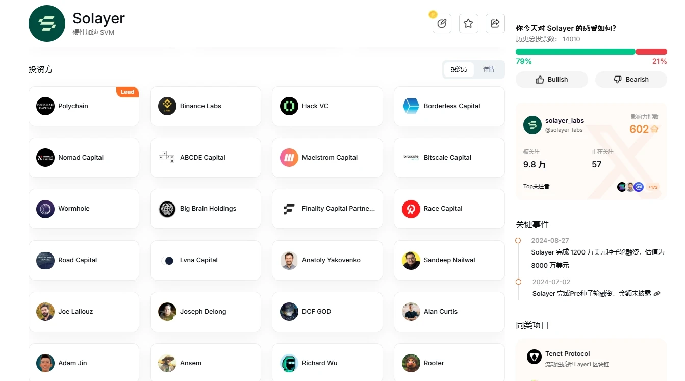 简单理解,Solayer 跨界进入 SVM 赛道,要跟一堆明星项目掰手腕。相比于其他选手,Solayer 坐拥 3.8 亿美金 TVL,在资产端有优势,而且有币安 Labs、Polychain、Hack VC 等顶级 VC 支持,TGE 预期拉满。