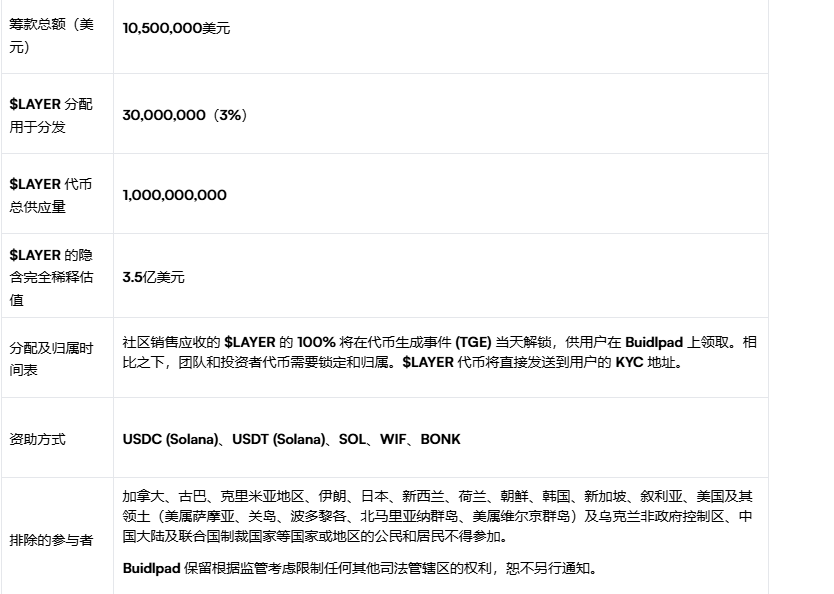 1月9日,Solayer宣布与Buidlpad合作发行首次社区发售。据公布的信息显示,LAYER代币的总发行量为10亿枚,本次发售为3000万枚,募资总额为1050万美元,代币的平均价格约为0.35美元,以此计算的代币估值为3.5亿美元。社区销售中100%的LAYER代币将在代币生成活动 (TGE) 当天解锁。