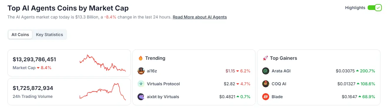 根据 CoinGecko 数据,当前 AI Agent 赛道的总市值达 133 亿美元,逼近千亿人民币,市面上的 AI Agent 项目层出不穷,鱼龙混杂。笔者在调研了超过 150 个 AI Agent 项目后,精挑细选出 70 个代表性项目,这些项目的总市值已突破 110 亿美元,涵盖了六大主要赛道。本文将通过这 70 个项目,为大家详细解析 AI Agent 赛道的全貌,揭示其中的机遇与挑战。