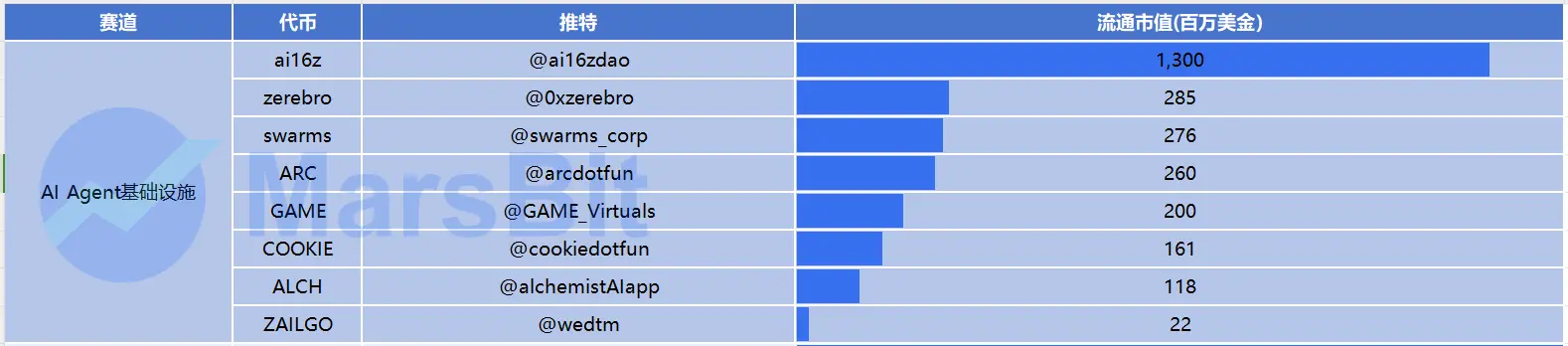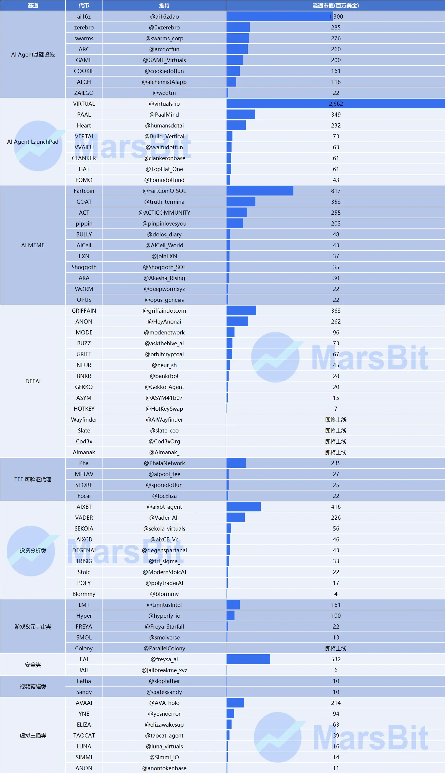 AI Agent 赛道的广阔与多样性,不仅体现在它能够跨足各行各业的边界,更体现在其细分领域的丰富多彩。为了帮助大家更清晰地了解这一迅猛发展的领域,笔者深入调研了市场上超过 150 个 AI Agent 项目,并从中筛选出了 70 个具有代表性的项目。这些项目跨越了 AI Agent 基础设施、AI Agent LaunchPad、AI MEME、DEFAI、TEE 可验证代理、AI 应用这六大赛道,且市值总和突破 110 亿美元,展示了 AI Agent 在不同场景中的独特潜力。