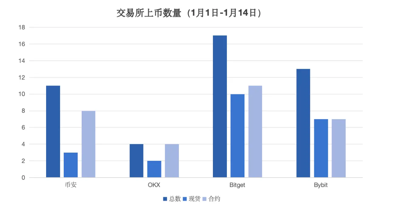 各大交易所在今年伊始就已经开始纷纷上币。从数据来看, 其中 OKX 上币策略最为保守,仅上线 4 个代币 。 Bitget 则采取了更为主动的上币策略,今年迄今为止上线了 17 个代币且其上线现货比例最高。 币安和 Bybit 分别上线 11 、13 个代币,其中币安上线现货比例最低。
