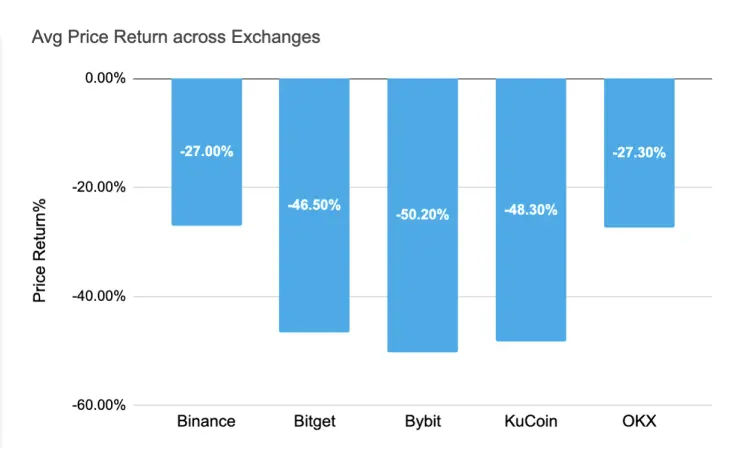 上述表格内统计了四大交易所 1 月份以来上新的所有代币(现货及合约),为避免插针现象,统计的价格为当日开盘收盘价中的高者。从以上数据来看, 币安所有新币均为负回报,无一例外。Bitget 有 2 个项目在一众下跌行情中逆势上涨,Bybit 有 1 个代币实现正回报,其余全军覆没。OKX 仅上线的 4 个项目也全部下跌。