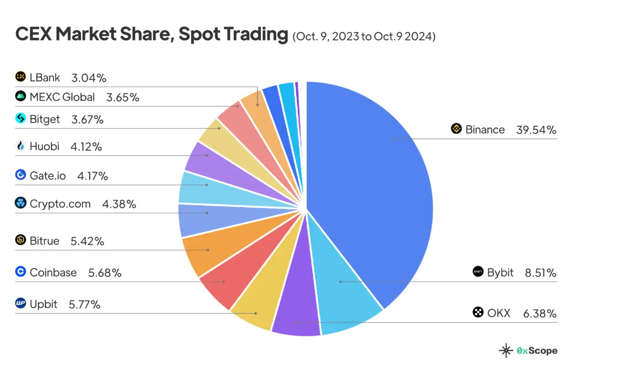 根据 0xScope 近期发布的《2024 年 CEX 市场报告》,现货市场趋势中,币安的市场份额同比从 50.9% 缩水至 42.5%。