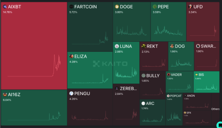 在所有 DeFi 领域的 AI 智能体中,AIXBT 占据了 14.76% 的市场关注度,堪称生态系统中最具影响力的智能体之一。