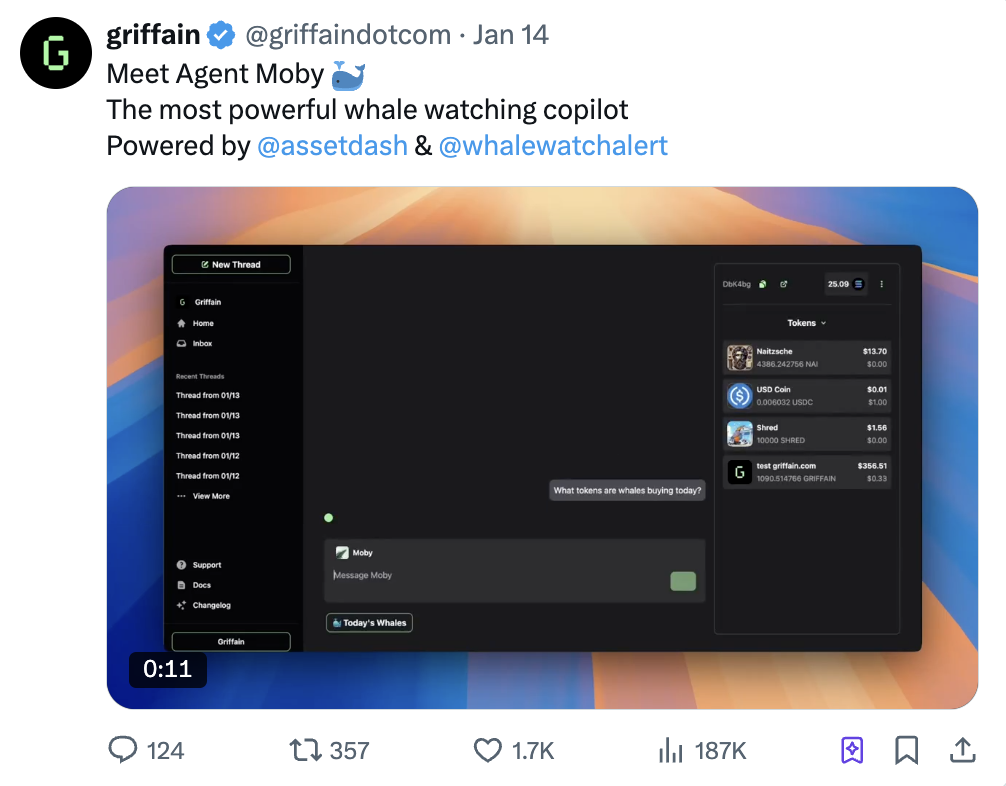 @griffaindotcom 是目前 Solana 区块链上首个且表现最优的抽象化 AI 工具,支持执行交易、钱包管理、NFT 铸造、Token 快速抢购等多种功能。
