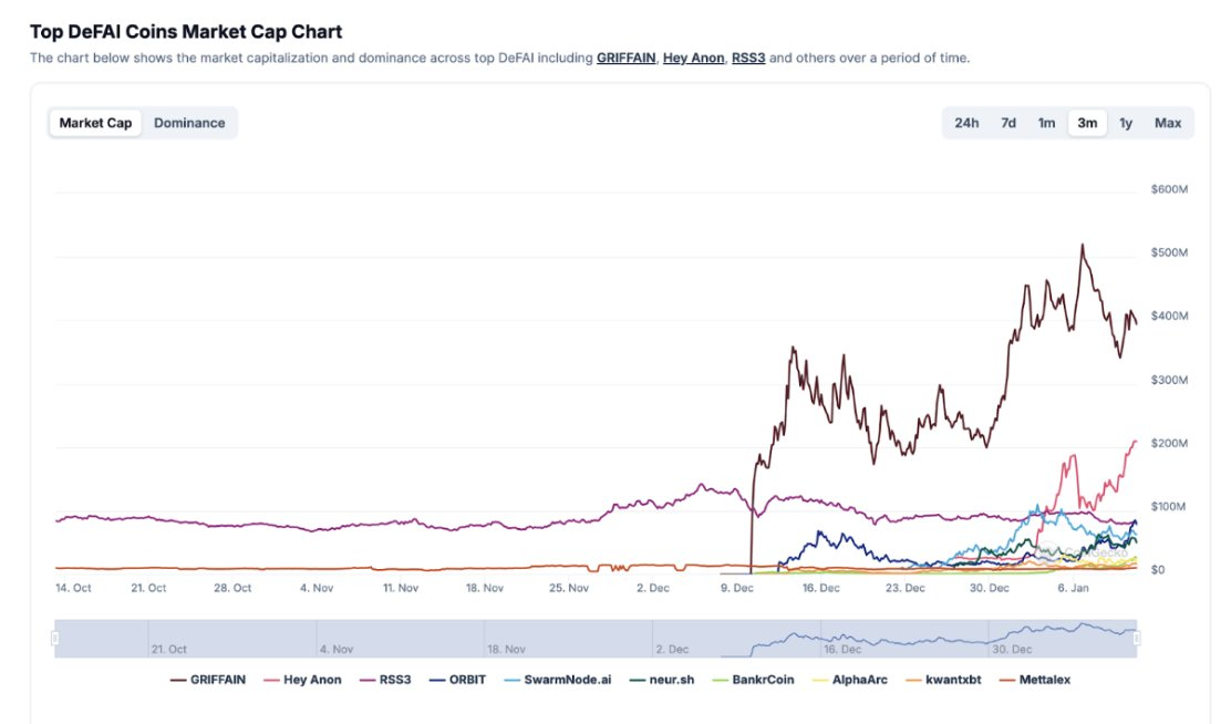 根据 CoinGecko 数据,截至 2025 年 1 月 13 日,DeFAI 的总市值已达到约 10 亿美元。其中,Griffain 占据了 45% 的市场份额,而 $ANON 则占 22% 。