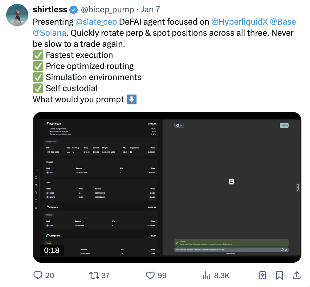 Slate 由 BigBrain Holdings 投资支持,其创始人 @slate_ceo 将其定位为“Alpha AI”,能够基于链上数据信号实现自主交易。目前,Slate 是唯一能够在 @hyperliquidX 平台上实现交易自动化的抽象化 AI 工具。