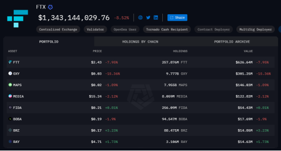 从目前的持仓来看,FTX 已经完成了大部分主流币的抛售,加密资产持有总量为 13.43 美元。现有持有量在一百万美元以上的币种 20 种,其中,FTT 价值最为集中,总额高达 6.26 亿美元,OXY 位于其后,总额为 3.01 亿美元,MAPS、Media 也持仓超过 1 亿美元。