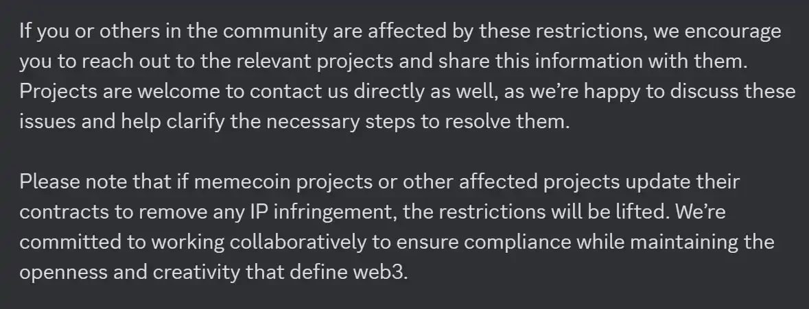 在他们的 Discord 频道中,官方的 Mod 表示,只要这两个代币进行「整改」,还是可以复活的,比如说把 Logo、代币网站上的侵权内容等等全部撤掉。