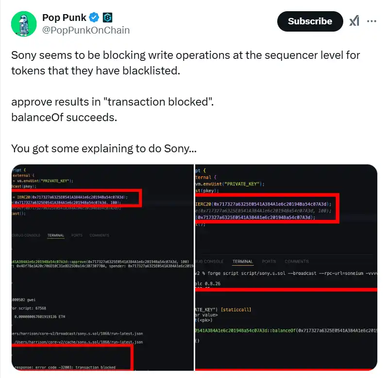 @PopPunkOnChain 称,「索尼链」官方似乎在序列器层面禁止了这两个代币的写入操作。