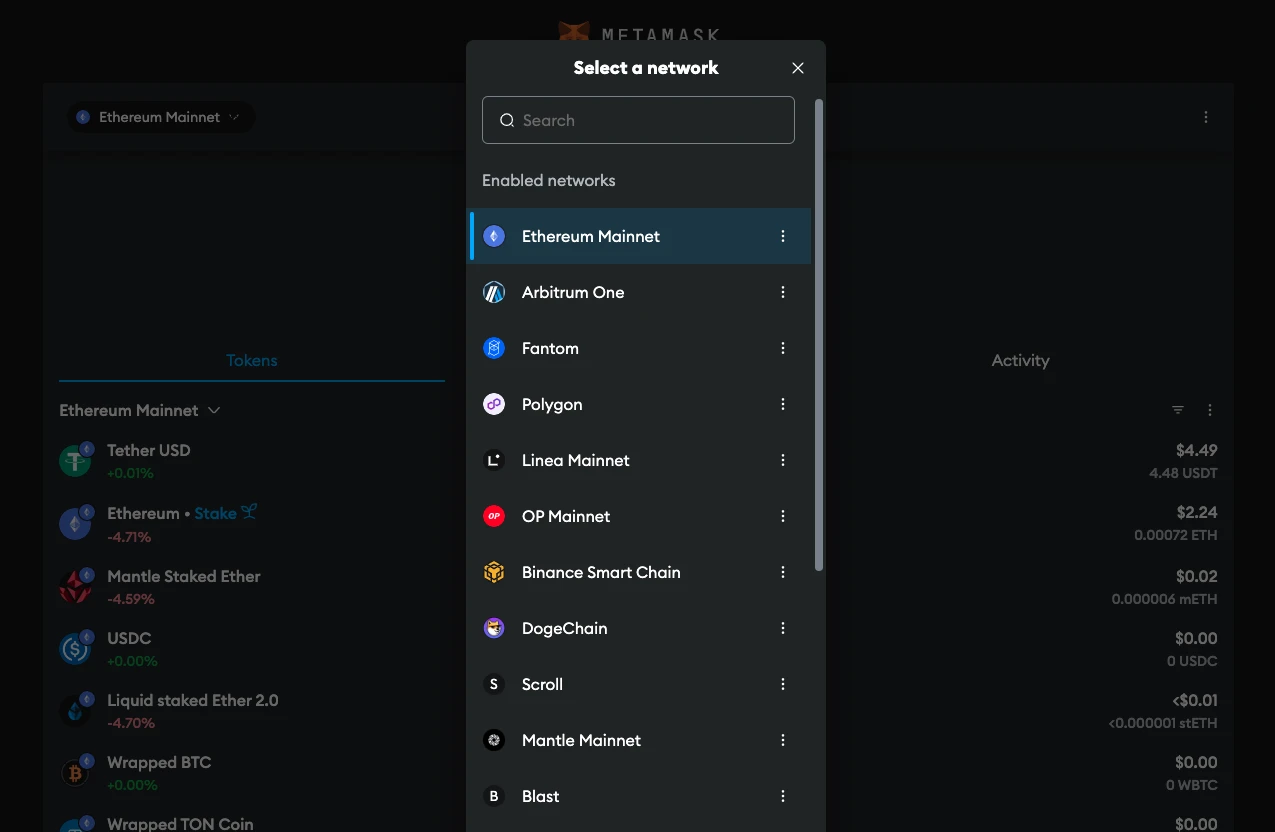 I. 打开 MetaMask(或其他兼容的钱包),切换到 以太坊 网络。