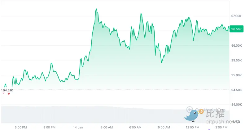 美国生产者物价指数(PPI)数据公布后,比特币继续反弹回升至 96,000 美元以上,过去 24 小时涨幅 2.5%,主流山寨币中,XRP、DOGE 以 6% 到 7% 的涨幅领涨。