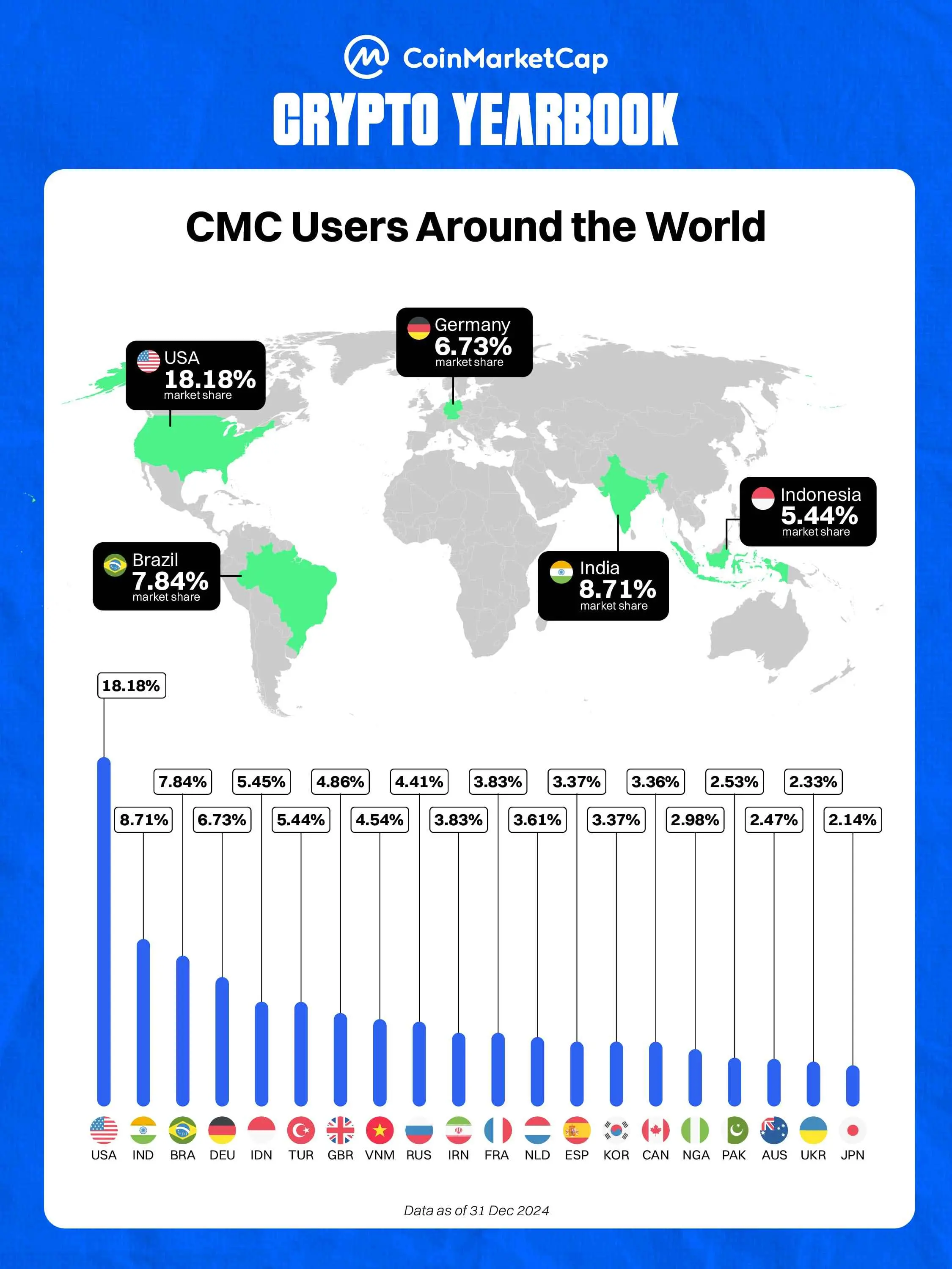 最近,CoinMarketCap 也发布了一份 2024-25 加密市场年鉴(Yearbook) ,梳理了过去 1 年的那些重大创新、震撼市场的时刻和令人难忘的里程碑,同时也对 25 年做了展望。