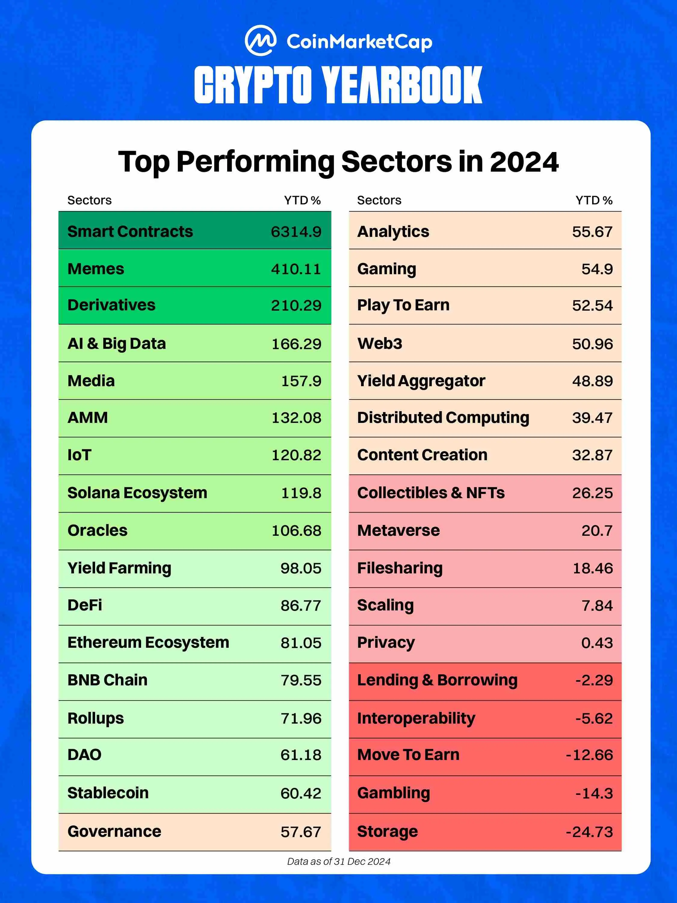智能合约相关项目以 6000% 的回报率位居榜首,而表现最差的是存储赛道,年回报率为 -24%。