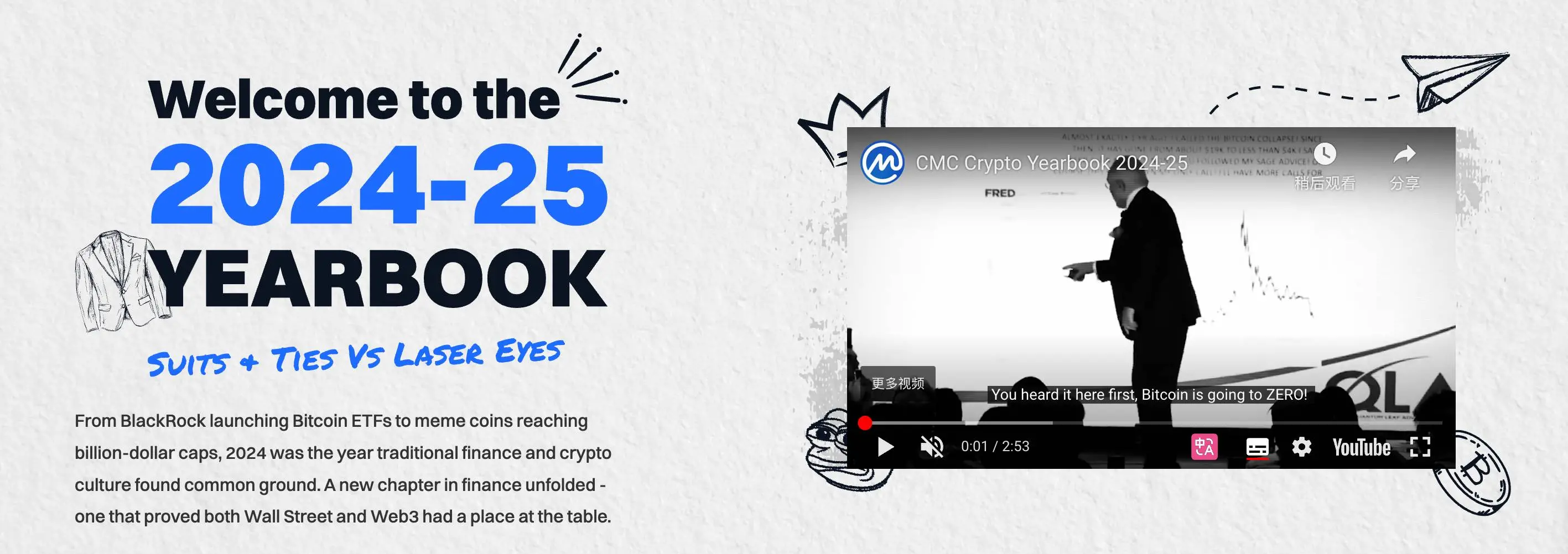 整个 2024 年,站在韭菜的维度你可能在思考某些币的涨跌;而在整个加密市场的风云诡谲中,年鉴则概括了一个更加宏观的趋势 --- “Suits & Ties VS Laser Eyes”(西装革履 VS 激光眼)。