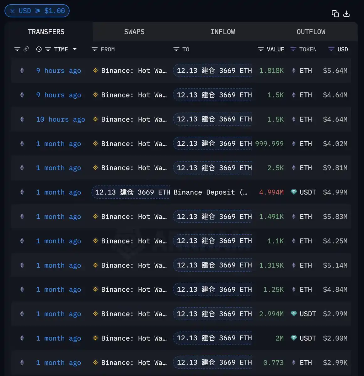 时隔一个月,「 12.13 建仓 3669 ETH 新地址」在周一暴跌时再次加仓 4817 枚 ETH,价值 1492 万美金;2024.12.05 以来该地址已累计建仓 13, 479 ETH,总价值 4278 万美金,成本 $ 3622 ,目前已浮亏 590 万美金