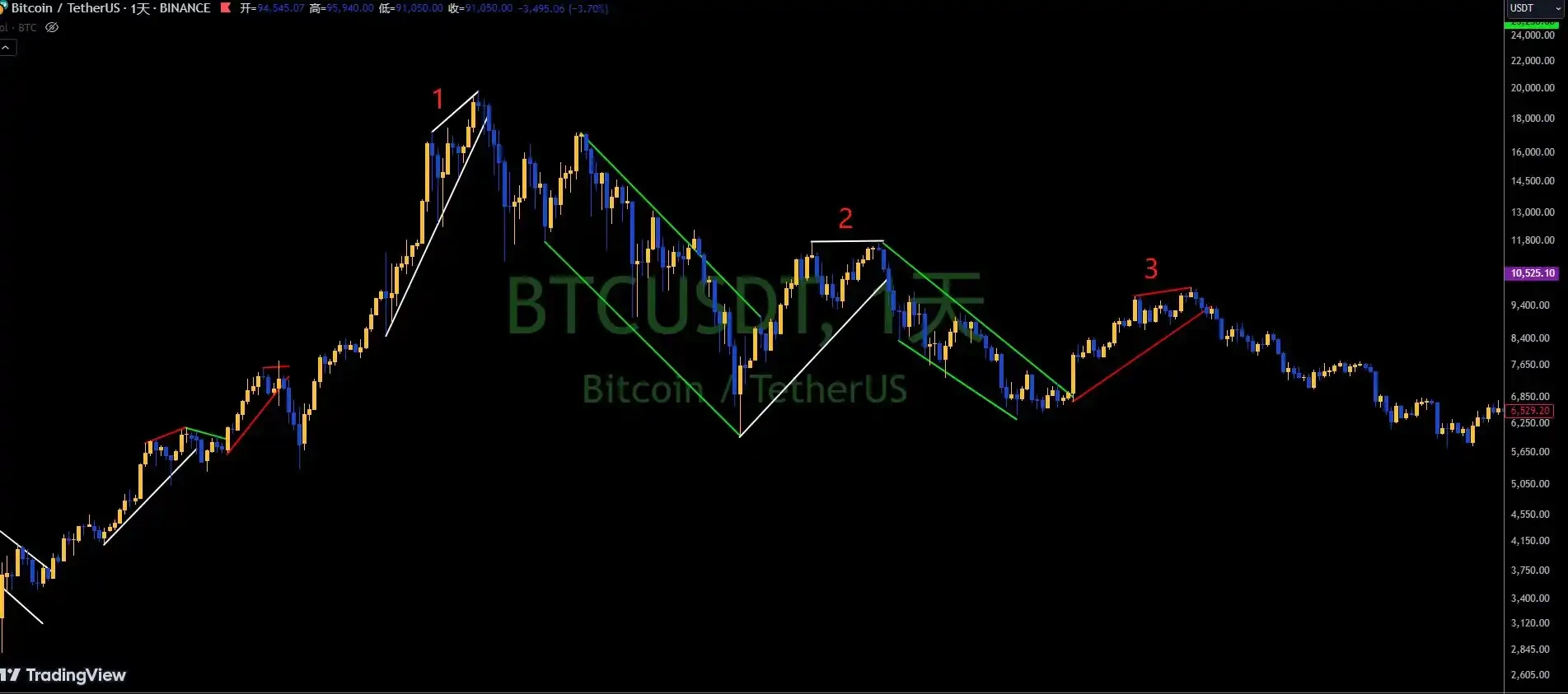 复盘历史,历史就是老师,这种结构出现概率很多,而且后面都是大级别回撤,至少要回撤掉前面大波段的 50% ~ 0.618% ,比较凶残的就是 5.19 那年,回到了起涨点,那个是极端情况需要各种因素加持。我们只说普通情况,上周所说的 85000 就是依据此计算出来。