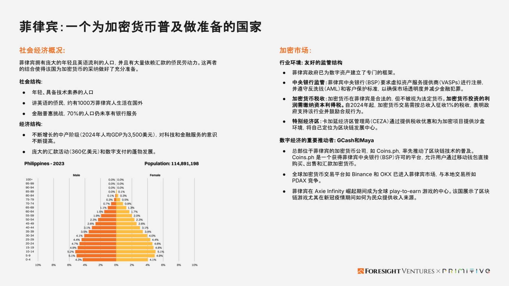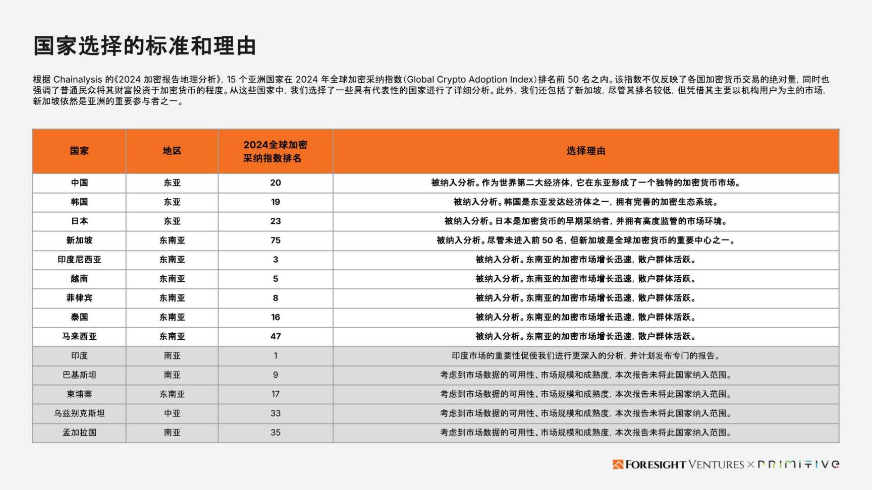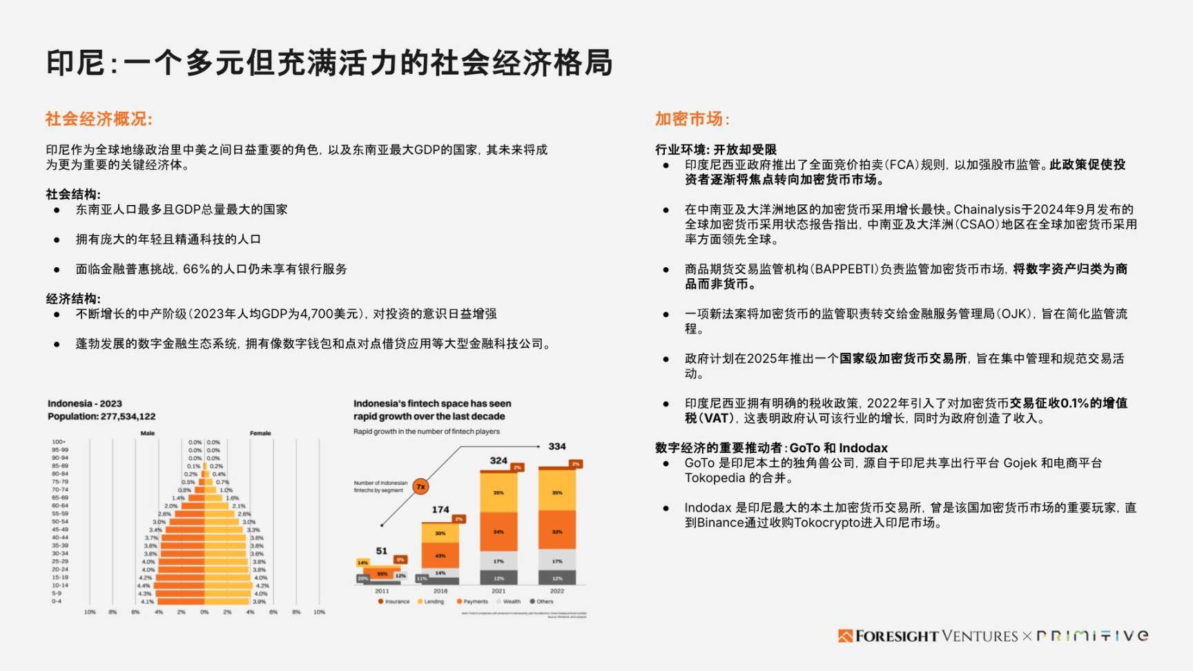 Foresight Ventures 与 Primitive Ventures 联合发布了《亚洲市场入局指南》报告,深入分析亚洲充满活力的加密市场,为探索该地区独特的机遇与挑战提供了关键指导。报告指出,亚洲是全球加密生态系统的核心,占全球加密用户的 60%,贡献了最大份额的流动性。关键发现包括:印度、印尼、越南等国家在 2024 年全球加密采用指数中排名前列;亚太地区的社会经济多样性推动了空投套利和迷因交易等行为;区域内的贸易和资本流动高度互联,显示出强大的内生凝聚力。报告还详细解读了中国、韩国、新加坡、越南和菲律宾等国家的加密市场特性,展现了亚洲在全球加密行业中的重要地位。