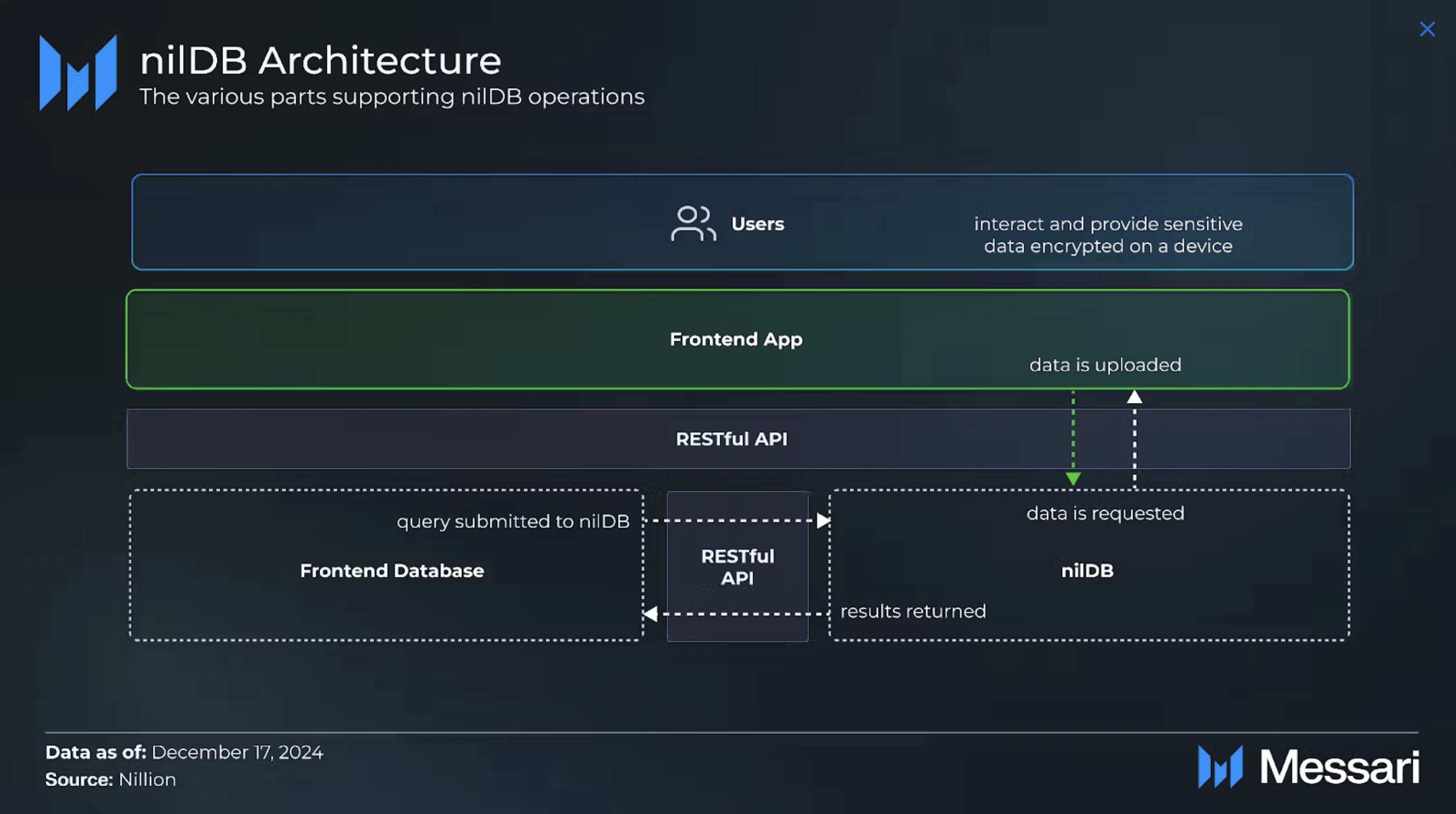 用户通过基于 Nillion 的前端应用程序安全上传加密数据。应用程序通过集成的后端 RESTful API 将加密数据安全上传到 nilDB。
