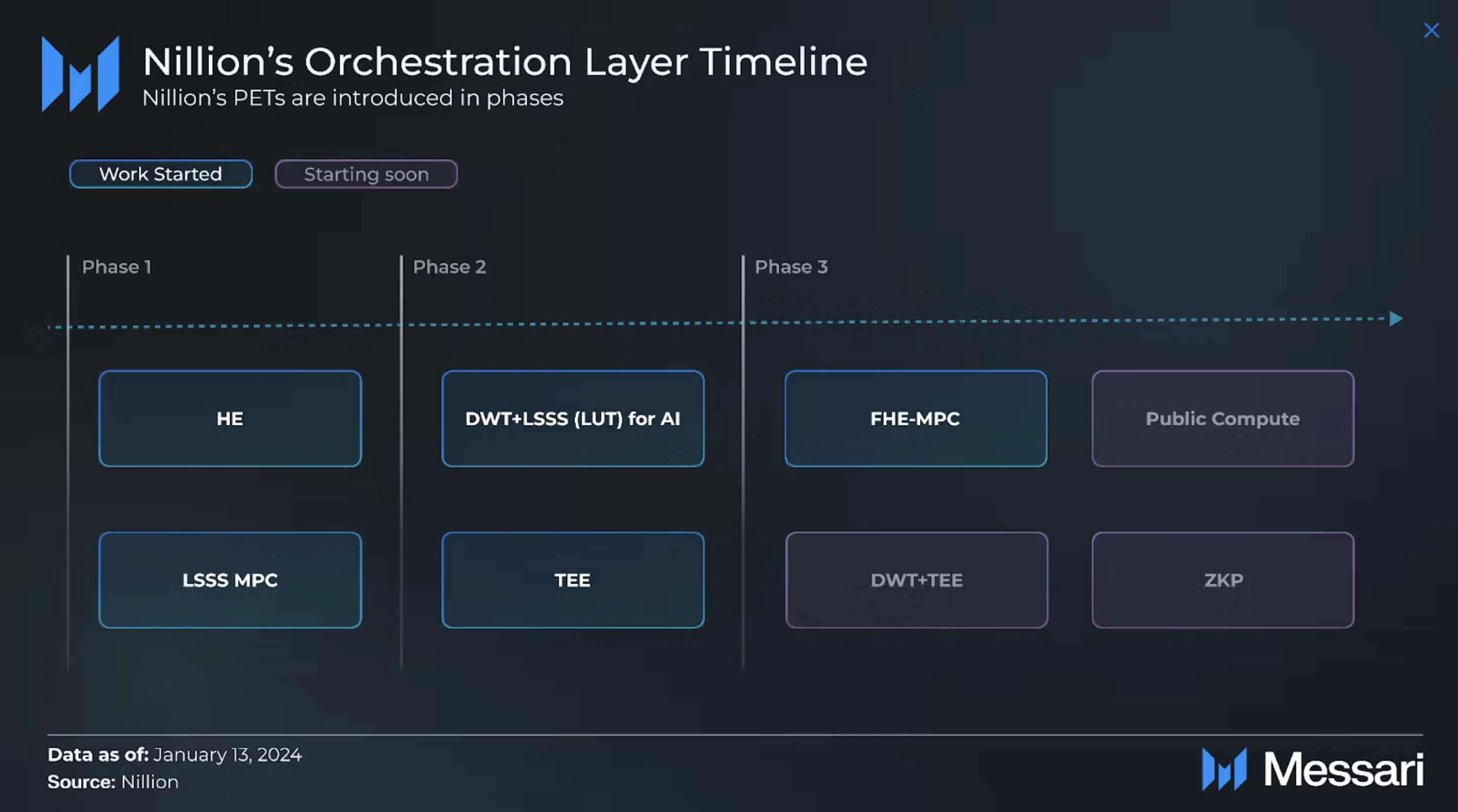 Nillion 的 PET 是分阶段引入的,每个阶段都经过上述四个抽象层级。第 1 阶段(即 HE、LSSS MPC)和第 2 阶段(即 DWT+LSSS、TEE)进度更快,已被集成到 Nillion 网络中。在第 3 阶段的技术(即 FHE-MPC、DWT+TEE、公共计算、ZKP)中,FHE-MPC 已开始在抽象层面取得进展。