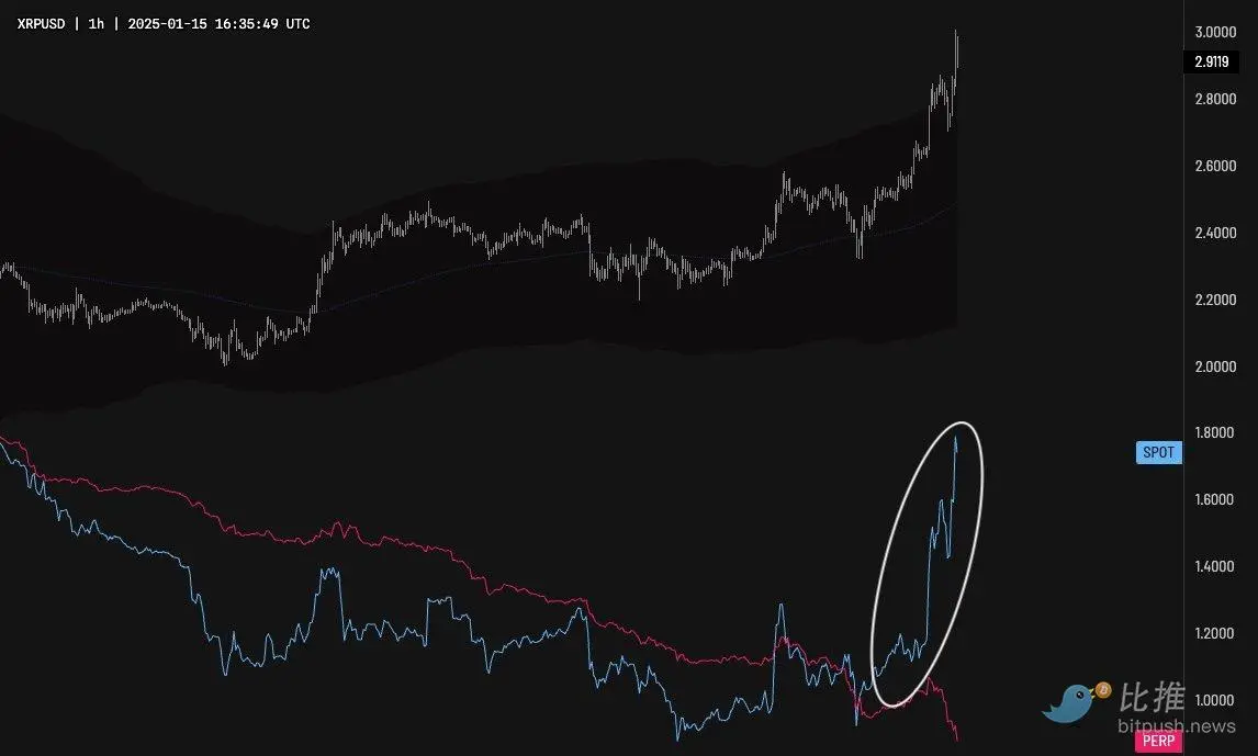 订单流分析师 Dom 表示,XRP 重测 3 美元完全由现货买盘驱动。他指出,在 XRP 周涨幅达到 15% 期间,XRP 的资金费率和现货买入溢价并未大幅上升。Dom 表示:「如果这是发生在比特币身上,我会直接说我们即将迎来大幅上涨。」