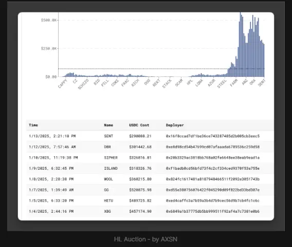 Hype 上有HIP-1 格式代币为主,必须由每31 个小时的公开拍卖所获得,最新的拍卖情况可以在AXSN Data 上找到、或是Hypurscan data 上找到最新的拍卖资讯,最近一期( 1/10 ) 项目大多是在30 万美金之间