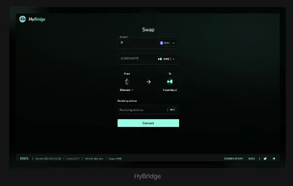Hyperliquid 官方渠道只接受来自 Arbiturm 上的 USDT、USDC 充值。Hybridge 则支援从 Ethereum、BASE、Solana 等 7 条链几乎各种资产跨链到 Hyperliquid 上,也能直接指定接收资产是 HYPE、USDC、FUN 等生态代币,文档介绍到当前正运行第 2 季积分活动。