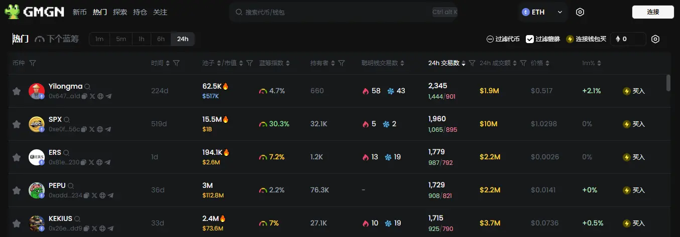 过去 24h 以太坊热门代币前五依次为: Yilongma 、 SPX 、 ERS 、 PEPU、KIKIUS