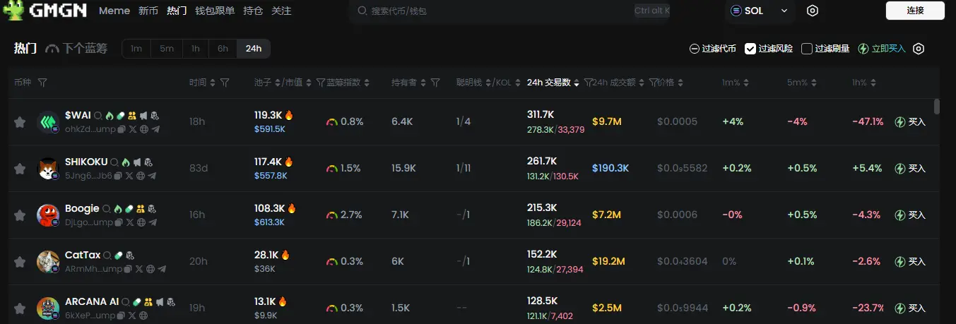 过去 24h Solana 热门代币前五依次为: $WAI 、 SHIKOKU 、Boogie 、CatTax 、ARCANA AI