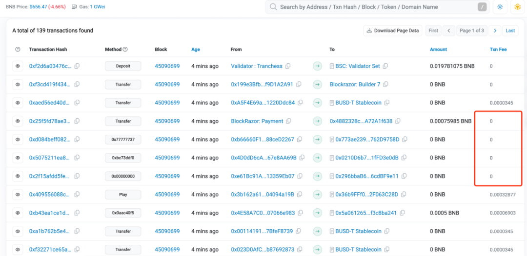 ③ 0Gwei交易支持: 在BEP-322 升级前,0Gwei 机制最早由48Club引入,该机制被作为48Club的会员特性推出,持有48会员代币KOGE达到一定条件即可使用,属于验证者对外提供的增值服务。在BEP-322 升级后,BSC验证者允许接收带有0Gwei交易的区块,与以太坊动态Base Fee机制不同,BSC链的交易Base Fee默认为0,即Gas Price为0的交易是允许的,作为最低GasFee保障机制的补充,BSC链设置了区块的Effective Gas Price不能低于1的限制。这种特殊的机制允许Builder在构建区块时纳入Gas Price为0的交易,使得区块空间可以更充分的被利用。