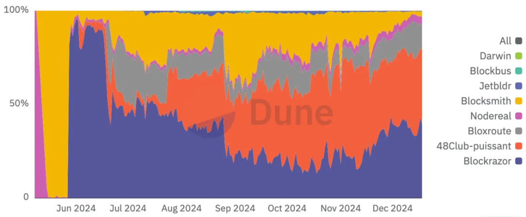 与以太坊相似的,在实施PBS之后,Builder市场形成并经历了一段时间的发展,最终形成头部-腰部-尾部格局。