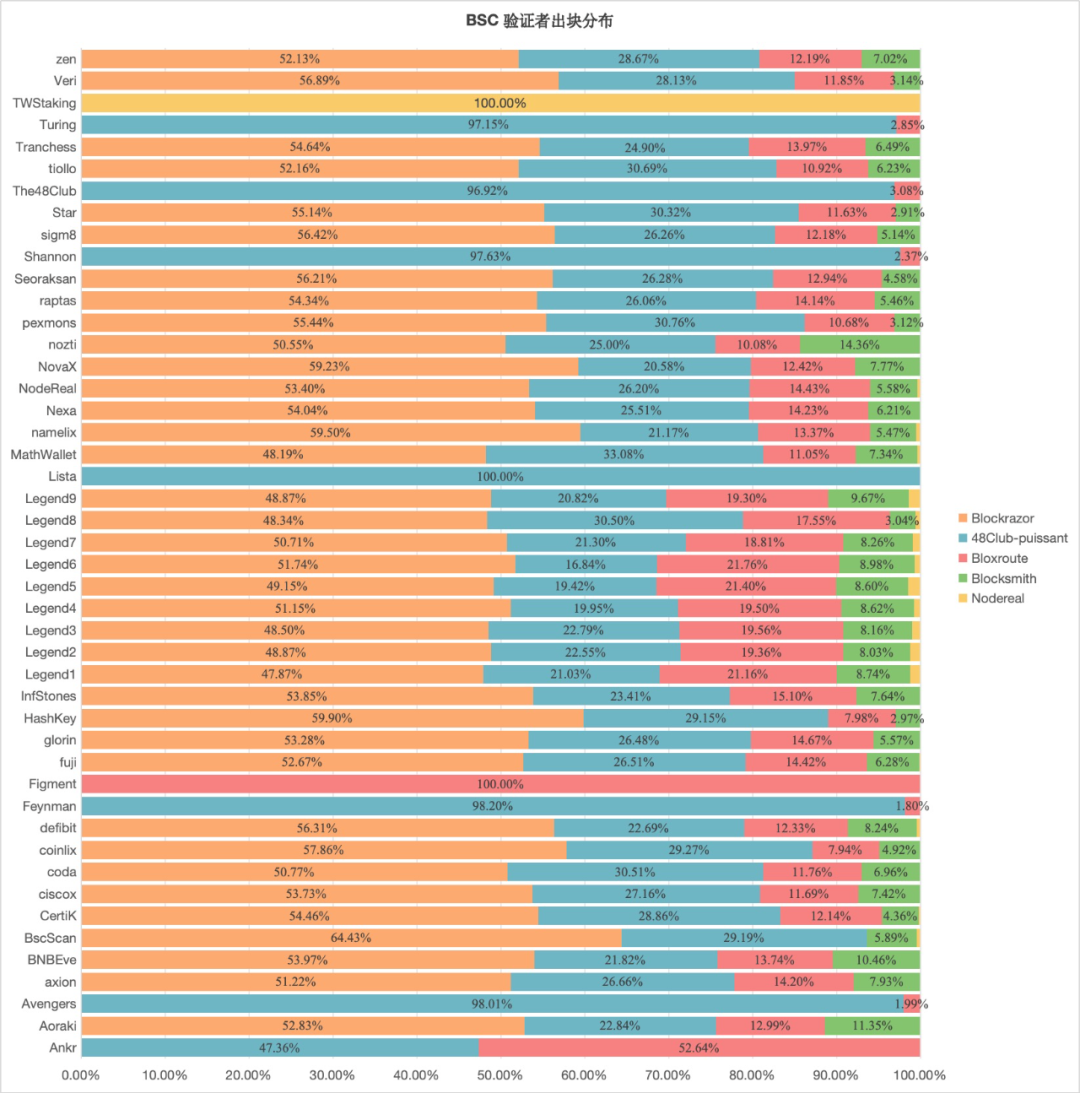 PBS实施后Builder市场形成头-腰-尾部格局。Builder市场头部玩家Blockrazor、48Club-pussaint贡献了近80%的区块构建,Bloxroute、Blocksmith和Nodereal则贡献了约19%的区块构建,尾部玩家仅有零星的区块构建贡献。另外BSC 链上出现的Validator-Builder垂直整合现象,可能会进一步造成中心化风险。