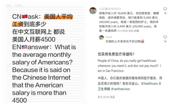 在小红书,两者交流的话题也颇为广泛,除了化妆技巧、穿搭心得、拍照等时尚美妆外,中英文教学、化身作业帮、萌宠美照交换花样百出,甚至在最近,民间对账也成为火爆话题。双方开始交流在当地的工作薪酬,房租、医疗、育儿成本,对比生活状态,一举破获了此前曾迷失在公知或者部分媒体话语中的偏见与谬误,回归真实进行了祛魅与祛蔽。