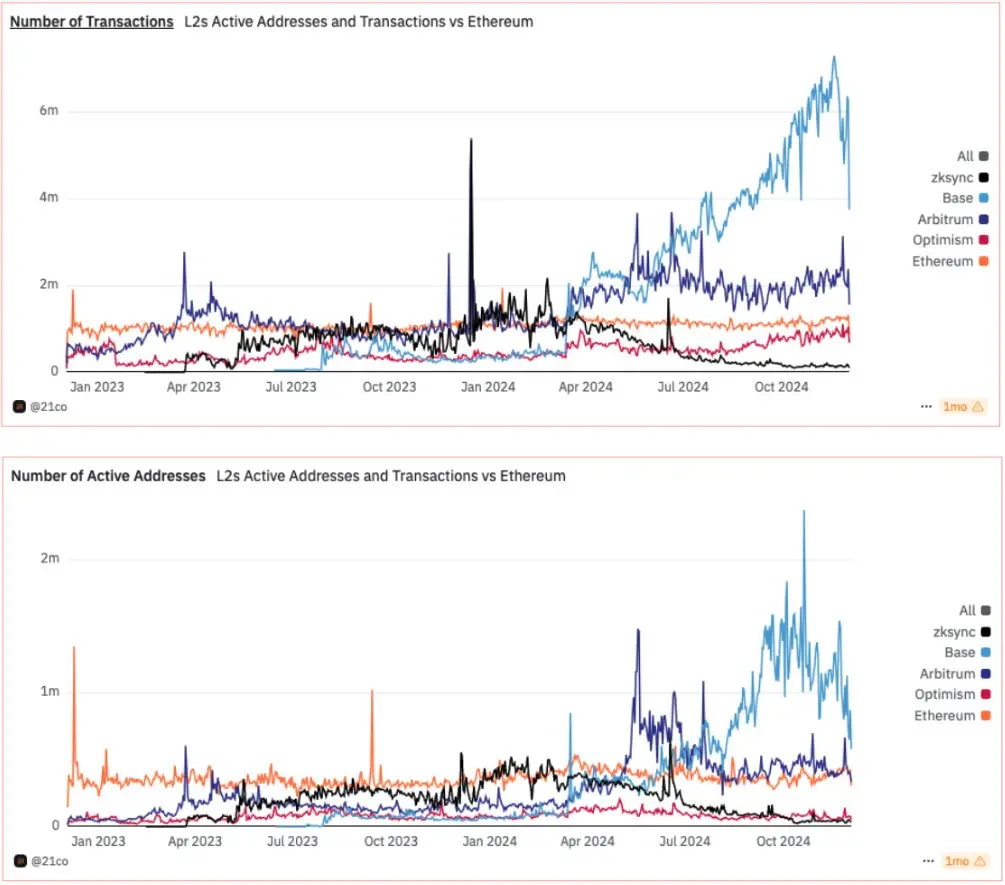 在比较活跃地址和交易数量时,Base 大幅领先,成为以太坊最受欢迎的 L2。