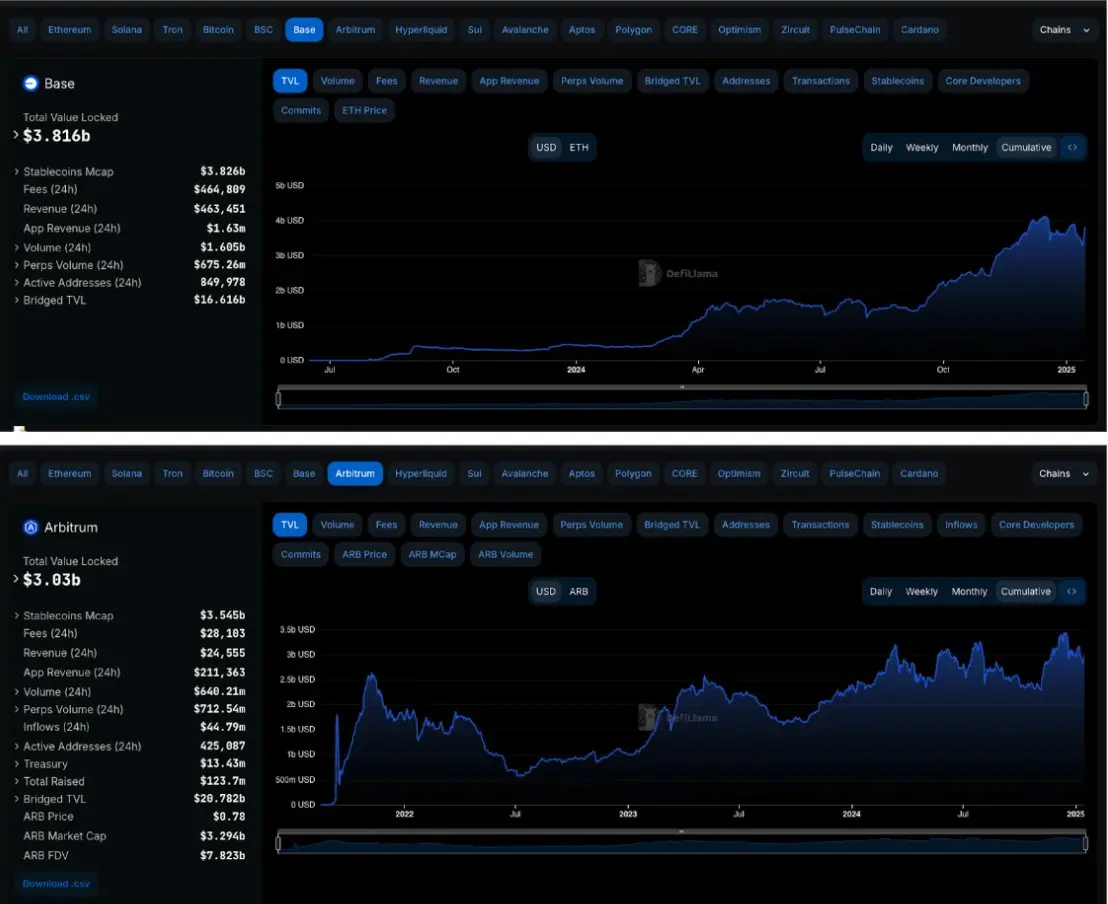 在比较总锁仓价值(TVL)排名前两位的 L2 时,Base 在一年半后 TVL 接近 40 亿美元,而 Arbitrum 在三年半后 TVL 为 30 亿美元。几乎从所有指标来看,Base 都是以太坊上领先的 L2。
