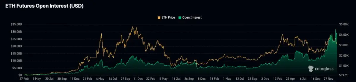 从各项指标来看,以太坊似乎估值过高。未平仓合约量处于历史高位,而 ETH 价格仍较 4800 美元的历史高点下跌了 30%。