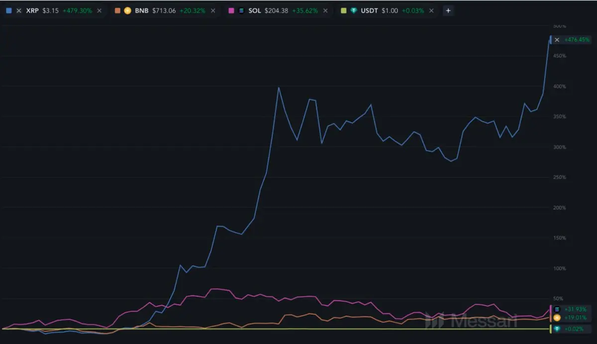 在美国大选之后的几个月里,XRP 经历了明显上涨。自那时起,XRP 价格涨幅超过 460%,市值已经超过 BNB、USDT 和 SOL。按完全稀释估值(FDV)计算,XRP 的估值是 Solana 的两倍,约为以太坊的三分之二。