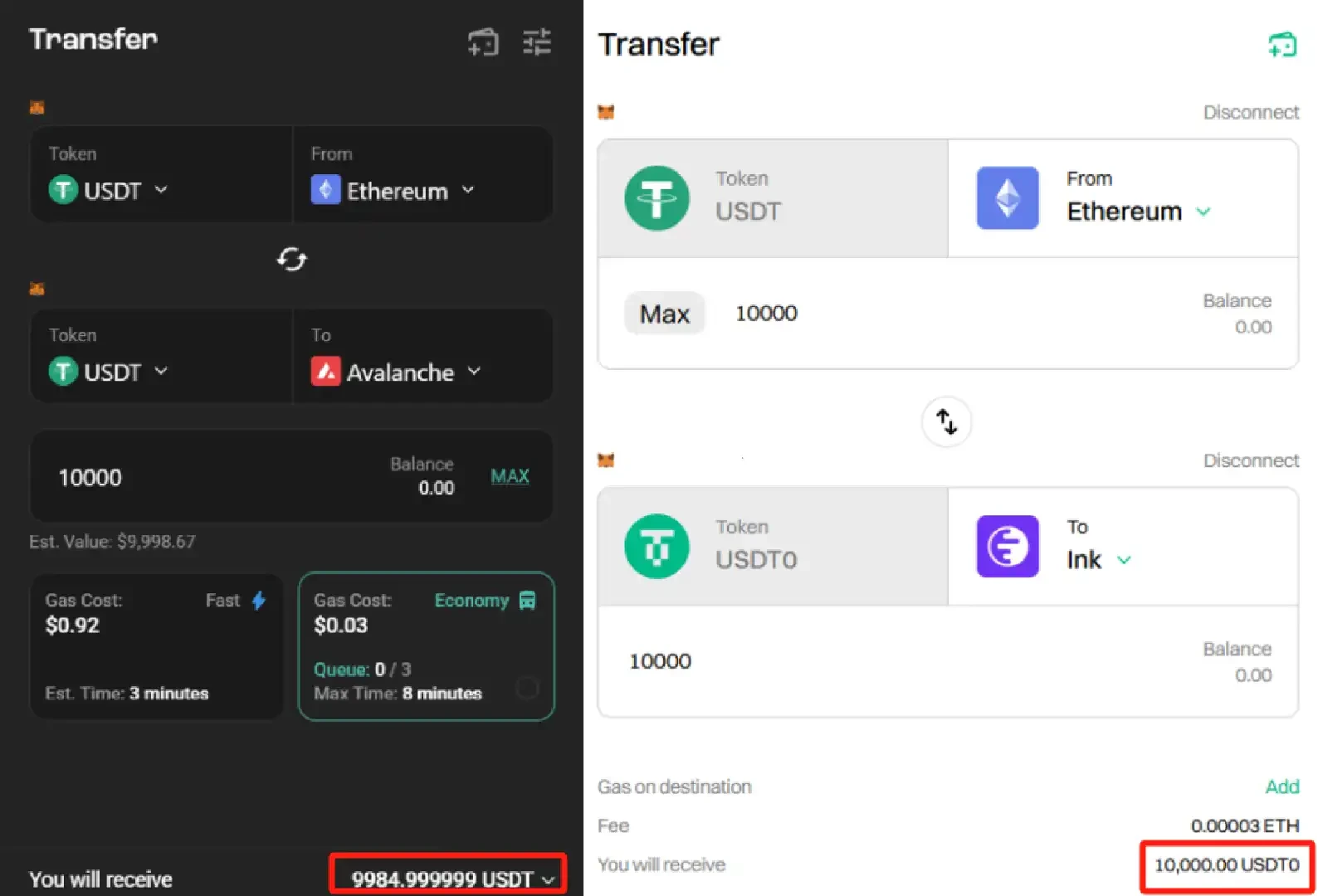对用户而言,USDT 0 消除了碎片化问题,意味着更高的资金效率。以下是一个从以太坊向 Avalanche 转移 10, 000 USDT 的例子(左),以及现在使用由 LayerZero 赋能的 USDT 0 (右)。可以看出,使用 USDT 0 ,用户跨链转出多少就能得到多少,大大降低了昂贵的手续费损失。